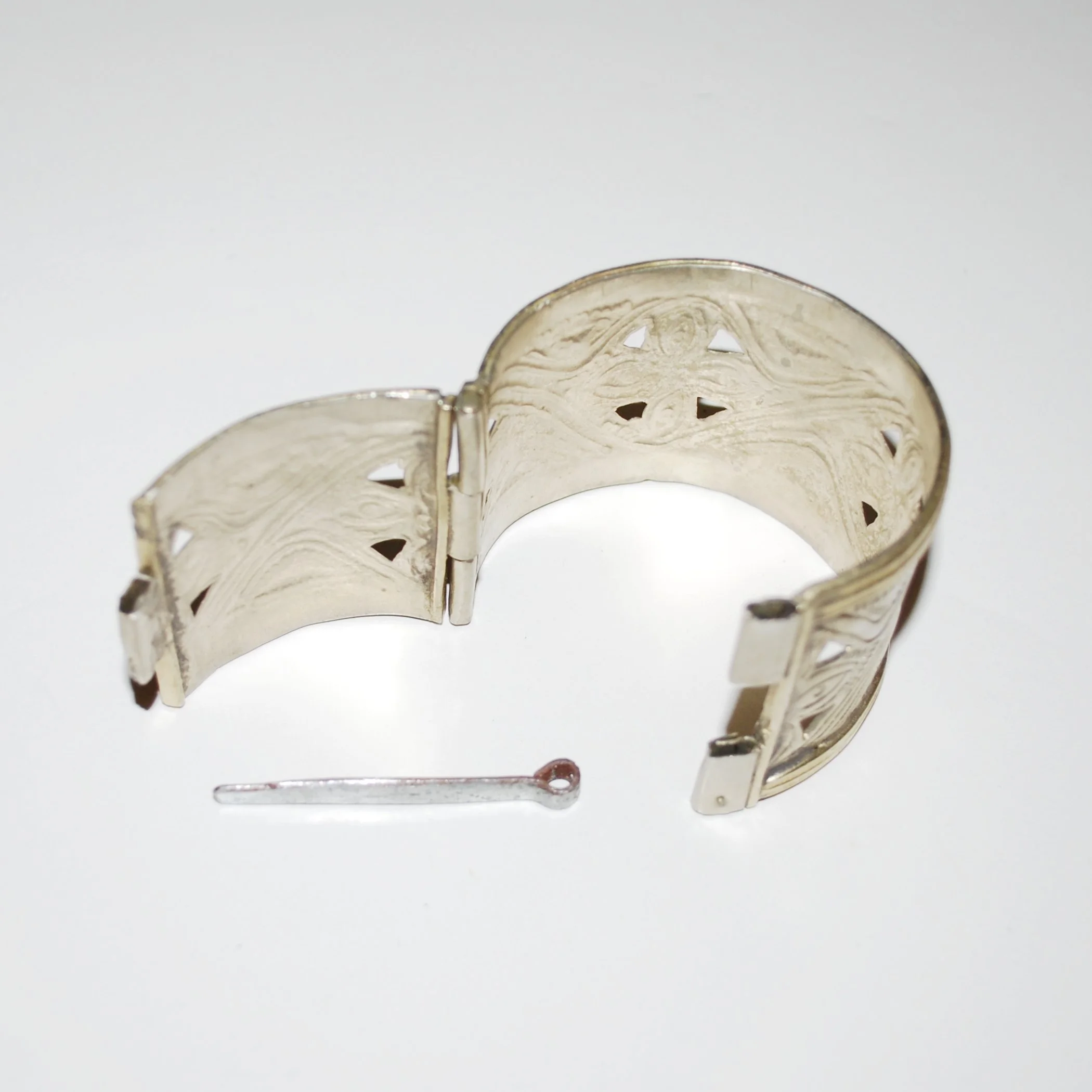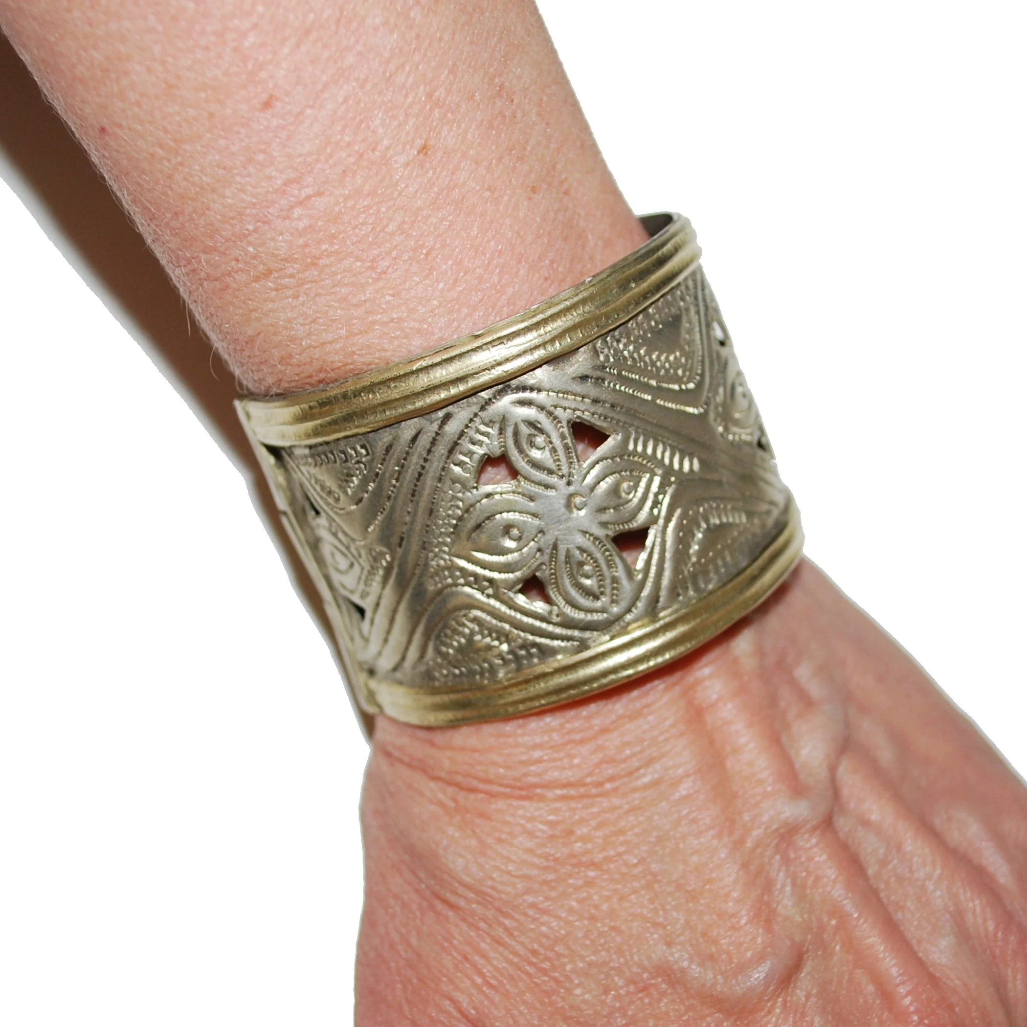 Small cuff bracelet from the Kashmiri region of Pakistan. Easy on and off pin and hinge design. Pin pulls up to open but does not come all the way out so can’t become lost. Pin fits securely. Looks great as a base piece in a bracelet stack. The story of Kuchi jewelry, like all tribal jewelry, is rich with influences from many cultures. These beautiful pieces with colorful glass jewels and jingling bells originally came from the nomadic Pashtoon tribes that wandered the border areas of Afghanistan and Pakistan, along ancient routes between the seasons, moving down from the mountains in the winter and back to higher elevations in the summer. The word Kuchi itself is derived from a Farsi word meaning migration, in relation to nomads and does not describe a particular group or people, but rather a state of being.