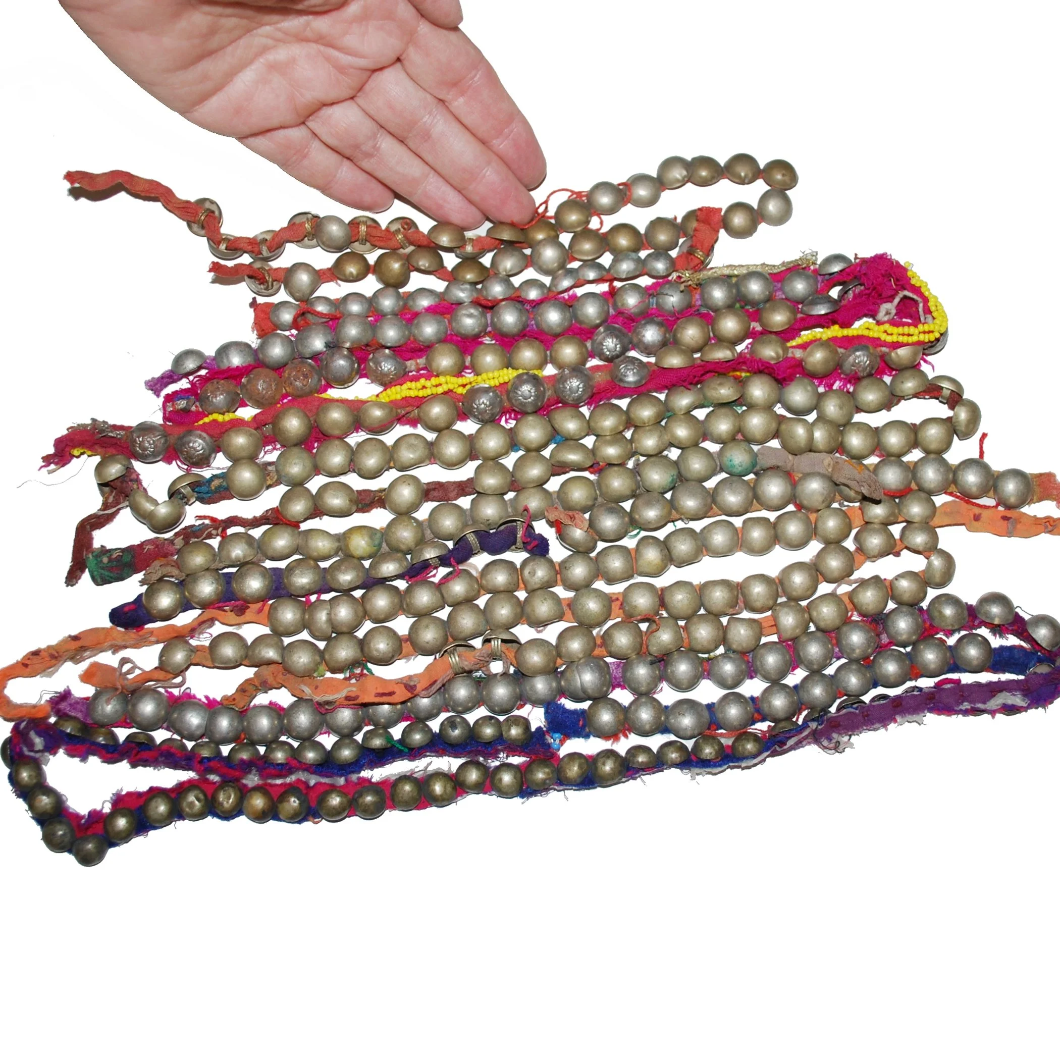 Lot of 11 vintage tribal Uzbek hair tassels. Tassels are traditional vintage "tulip" style tassels on woven bands. There are 11 woven bands ending in colorful tassels. Black tassel fringes with multi-colored crochet tops, thread wrapping and a bit of beading here and there. Long red and black woven bands can be tied or sewn to costuming or other items. These tassels are in vintage condition. Large bundle of tassels for troupe costuming, DIY projects or resale. These vintage tassels have obvious wear and some flaws. Some thread wrapping may be loose, some of the metal beads may be in poor condition. Check our Discount Lots section for more wholesale and discount tribal items!