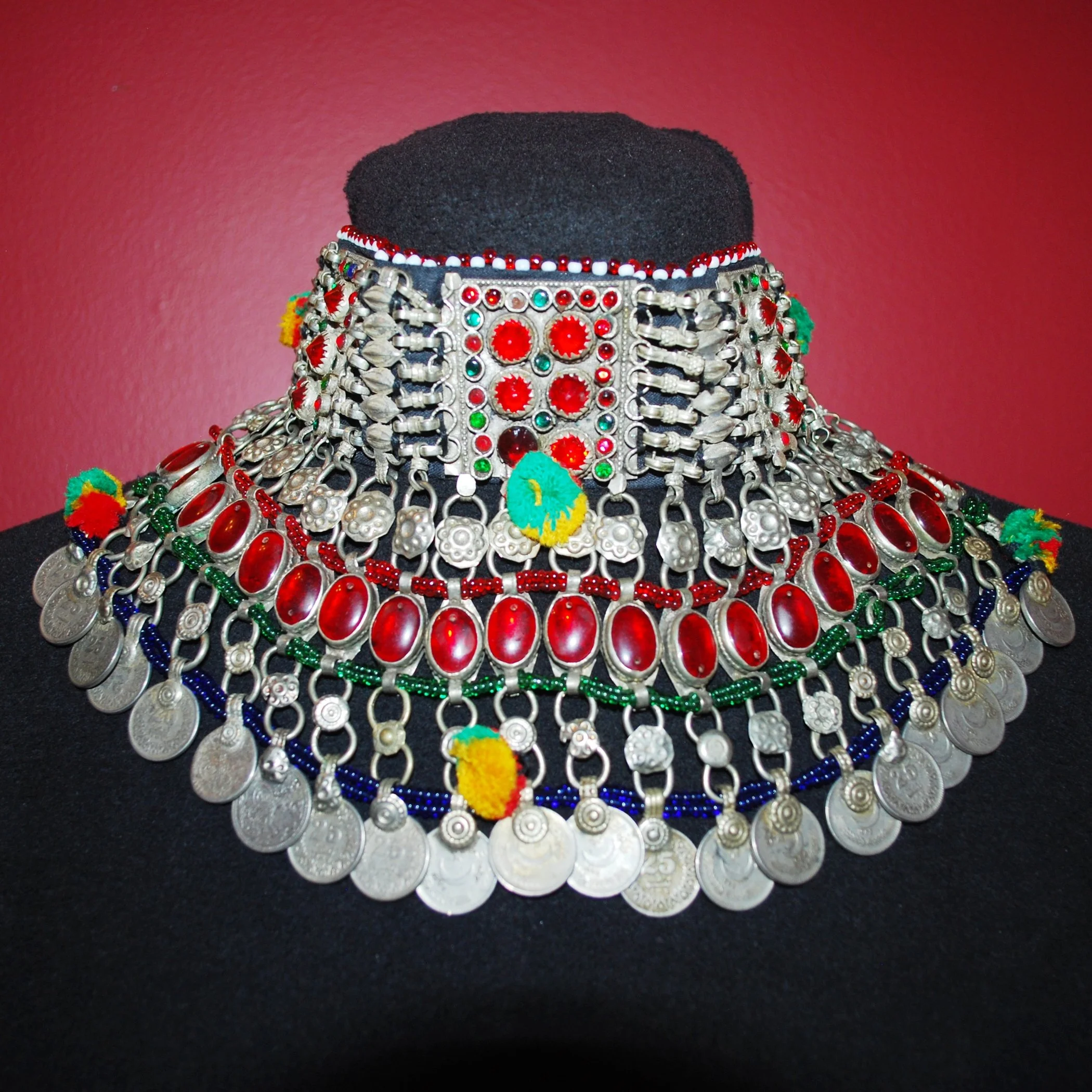 The story of Kuchi jewelry, like all tribal jewelry, is rich with influences from many cultures. These beautiful pieces with colorful glass jewels and jingling bells originally came from the nomadic Pashtoon tribes that wandered the border areas of Afghanistan and Pakistan, along ancient routes between the seasons, moving down from the mountains in the winter and back to higher elevations in the summer. The word Kuchi itself is derived from a Persian word meaning migration, in relation to nomads, and does not describe a particular group or people, but rather a state of being.