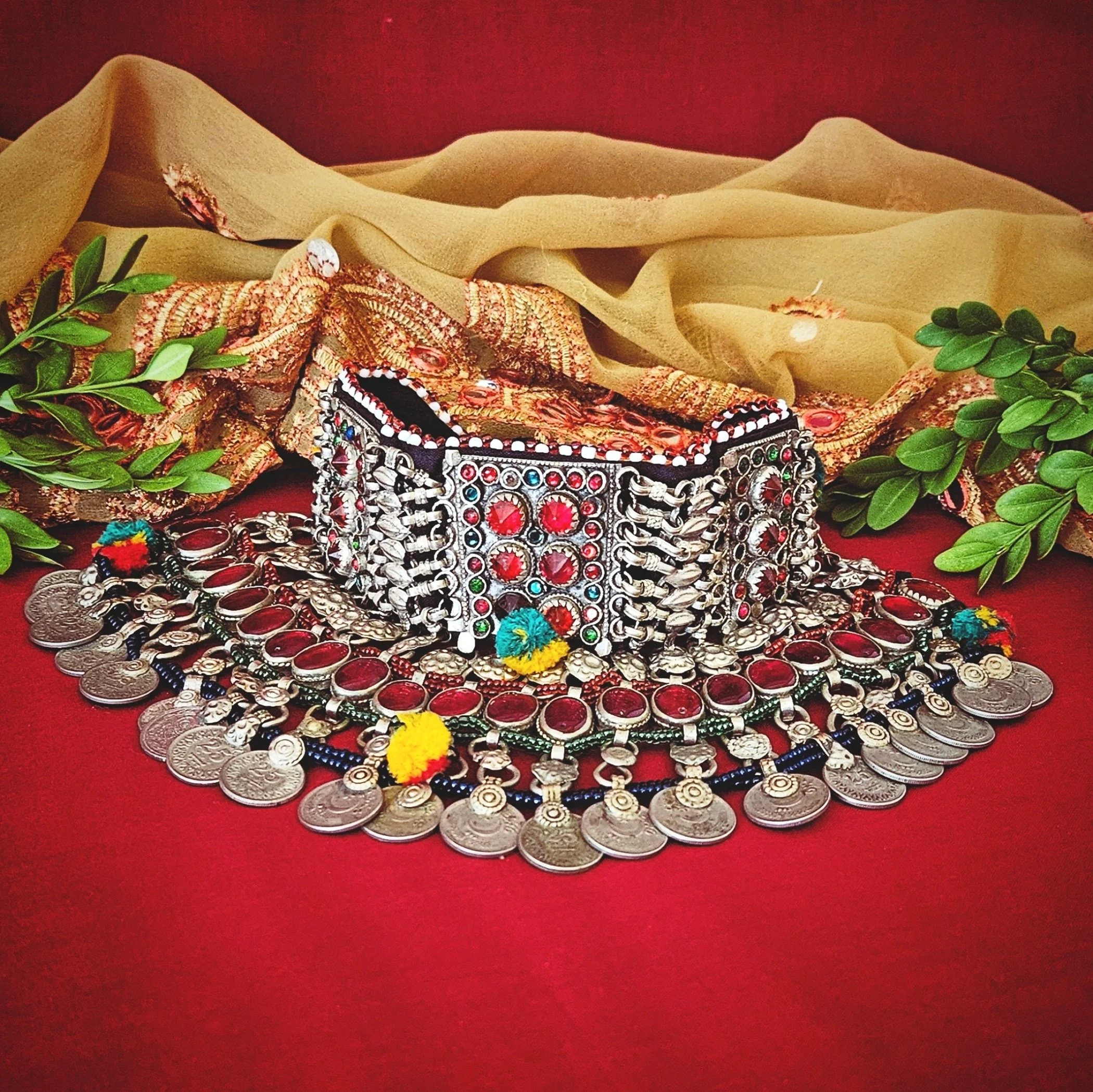 Vintage Kuchi choker with long fish dangles, large coins, colorful jewels, beading and poms. The fish links on this choker vary in design a bit, making this a unique piece with lots of character. Polished to a nice shine. These tribal chokers have been worn for centuries by nomadic peoples and continue to be popular today.