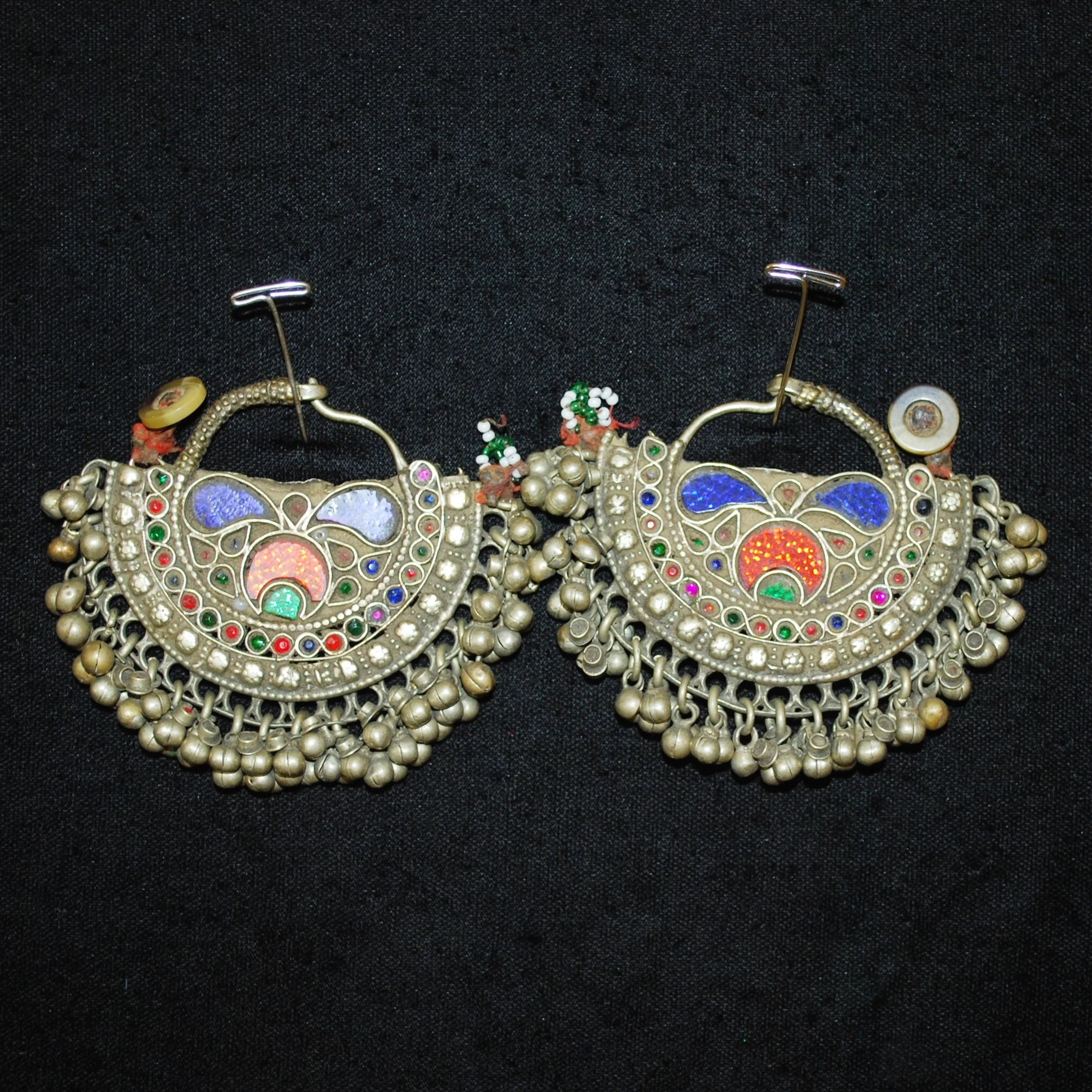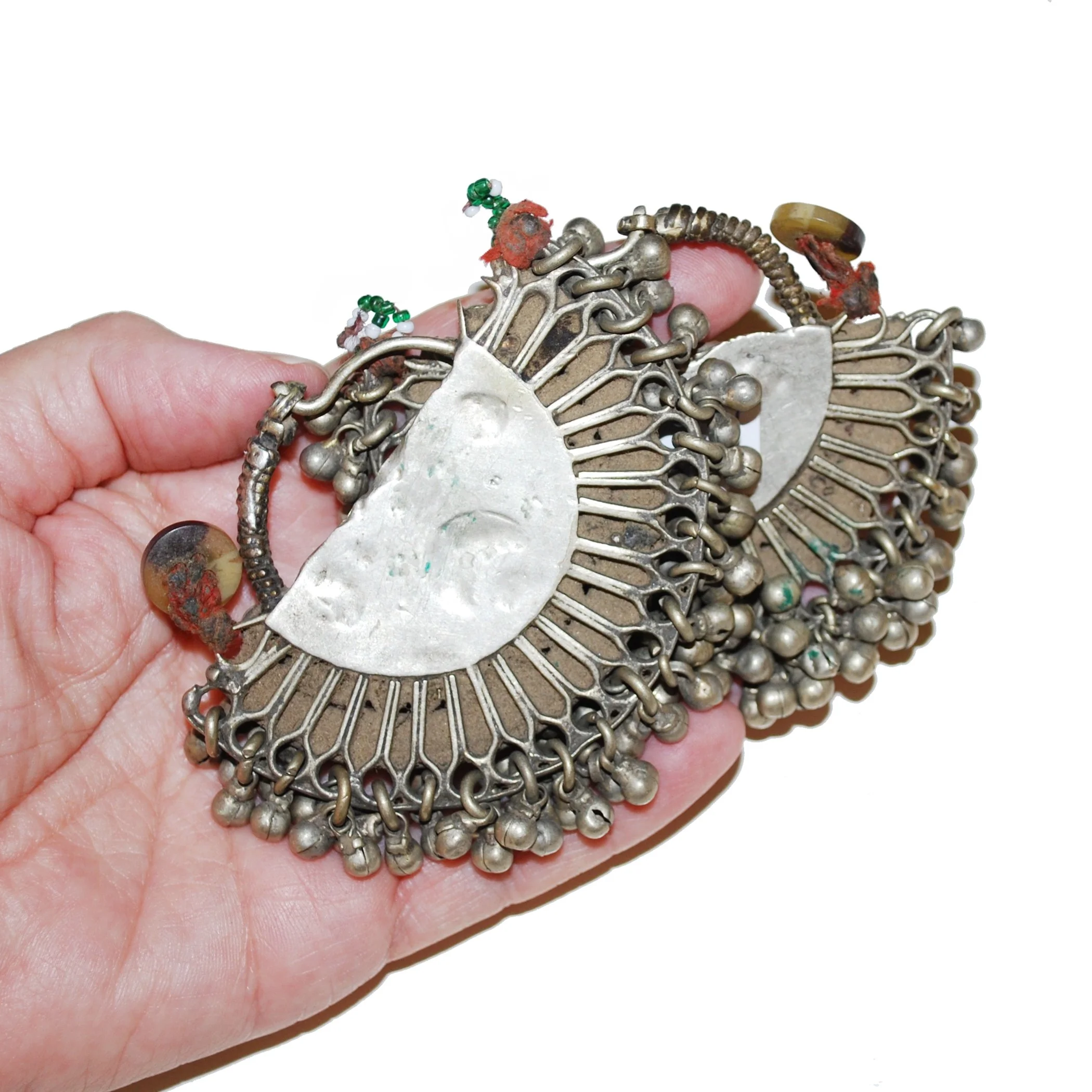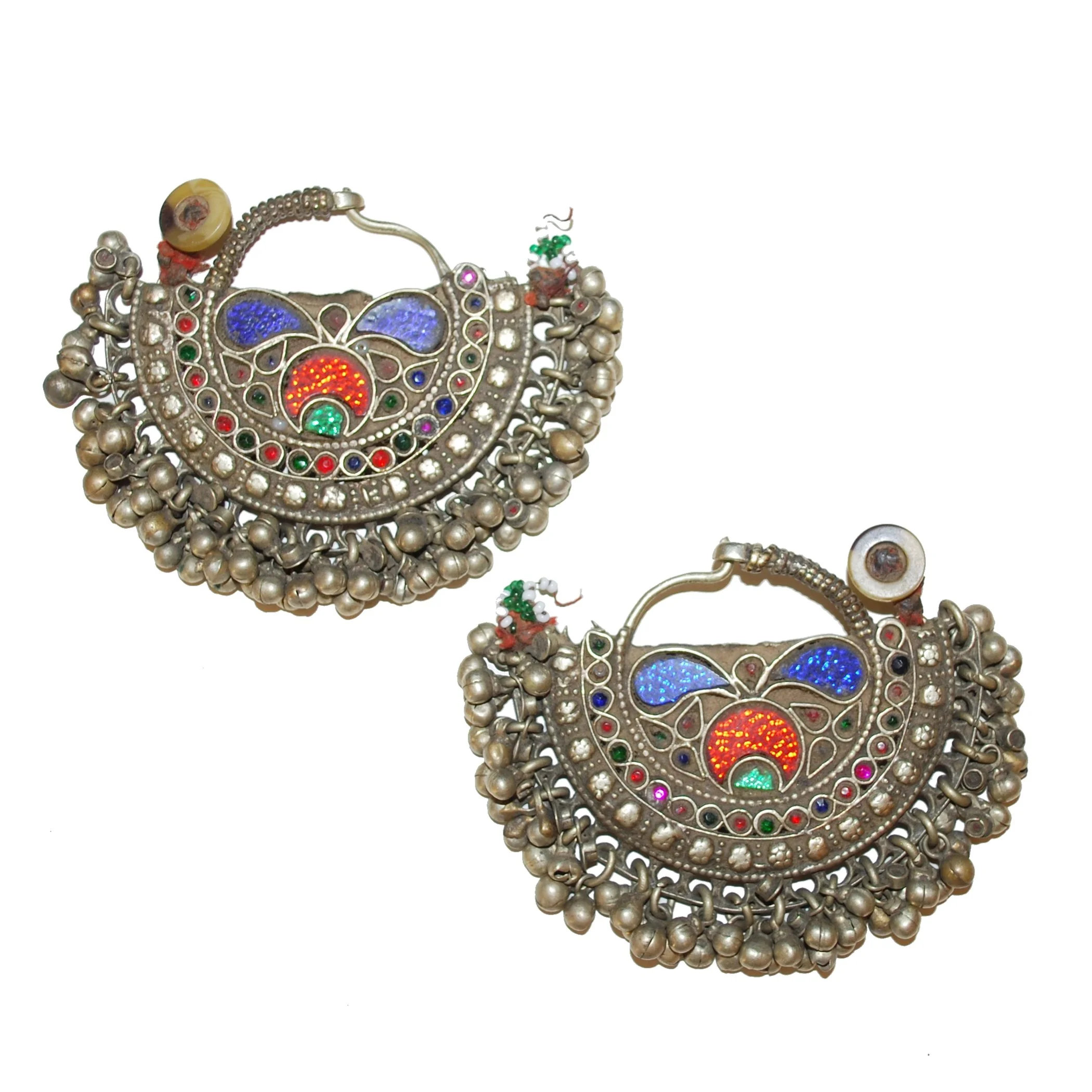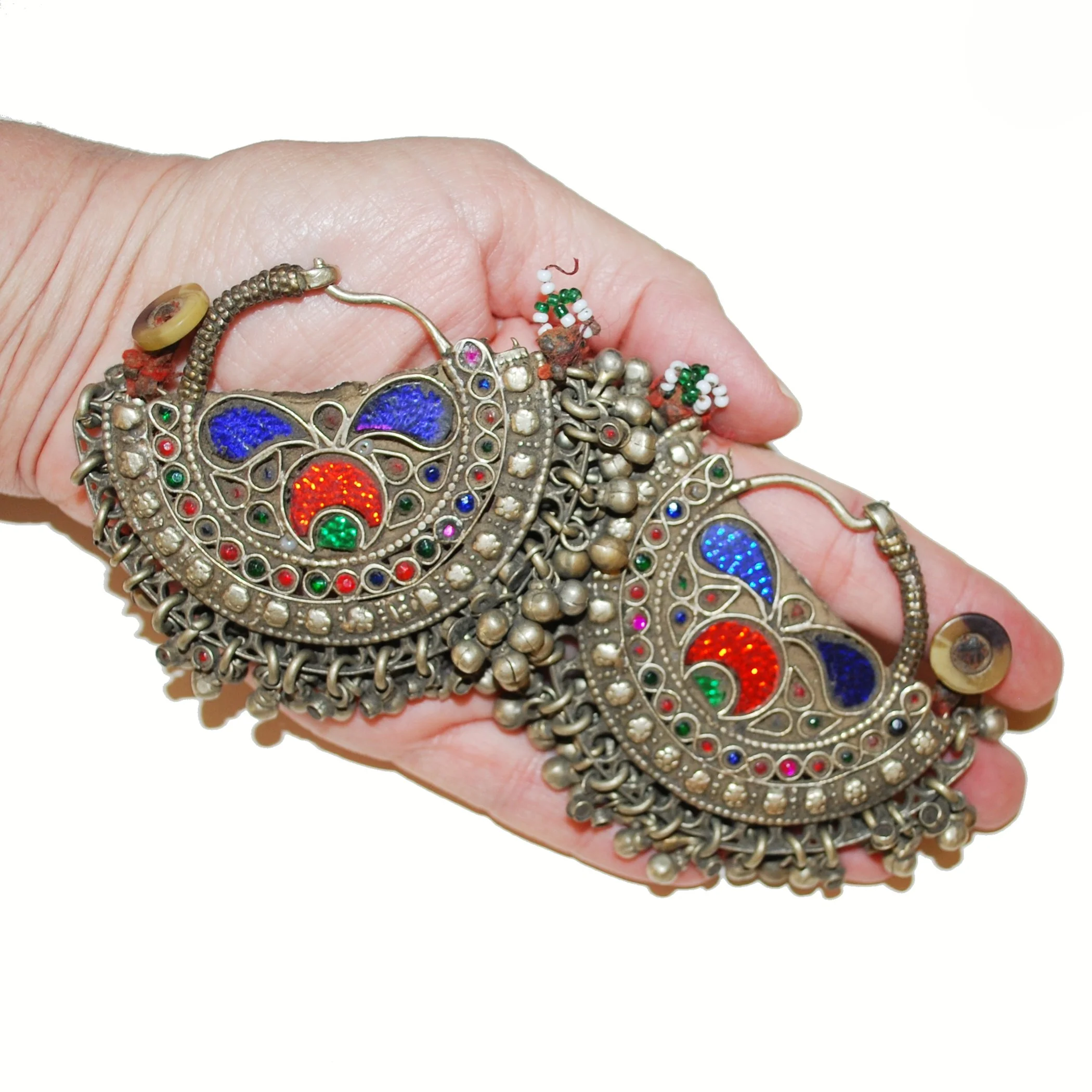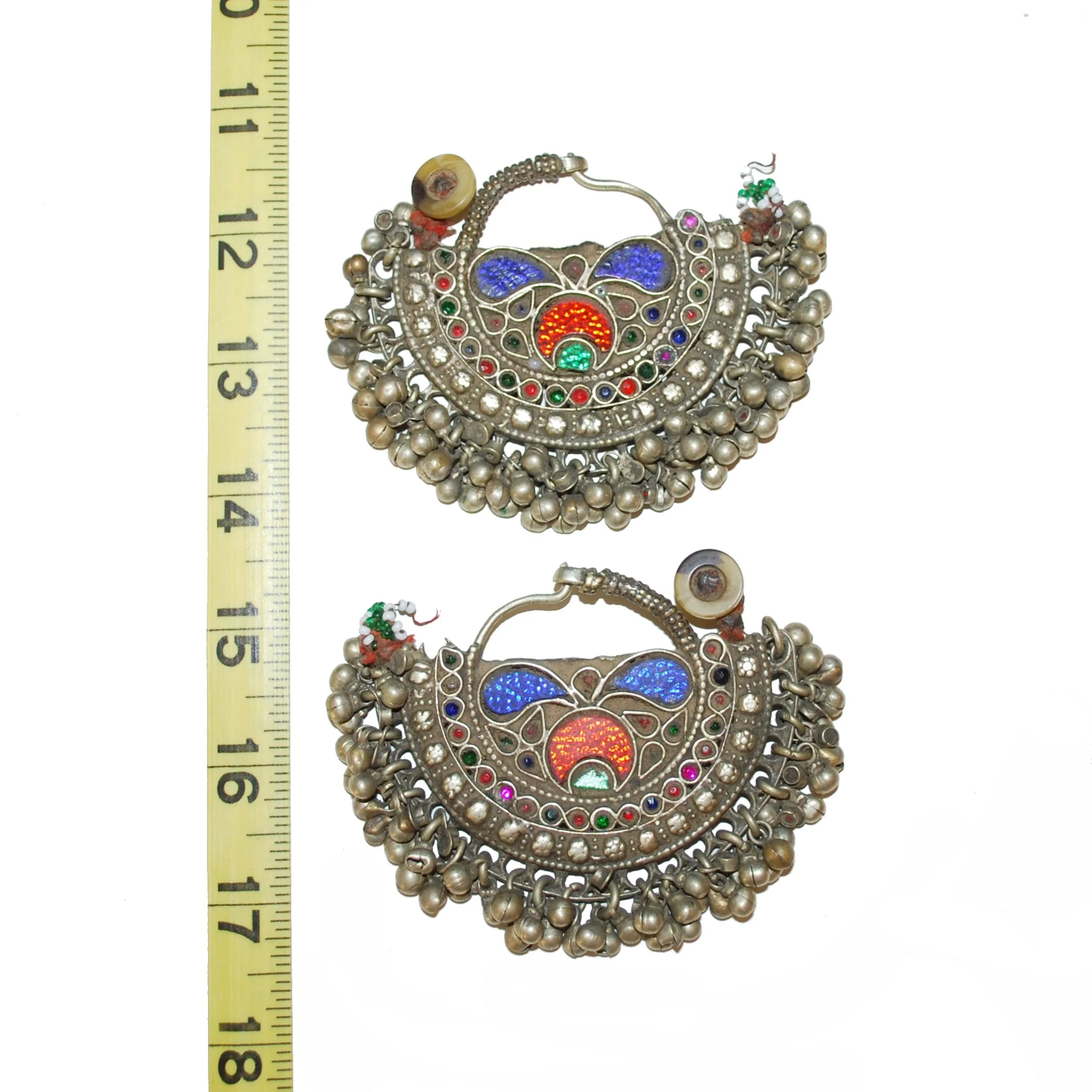 Vintage pair of Afghan jhumka earrings with a hook at the top and a bell shaped pendant with small dangles. Jhumka earrings are worn across southern Asia and eastward into Pakistan and Afghanistan. This pair is adorned with small stylized hamsa dangles. These might have originally been worn attached a headpiece since the wires are quite thick. They cannot be worn through western piercings, although you may be able to wear them in stretched piercings or through tunnels. Perfect for use on belly dance costuming.